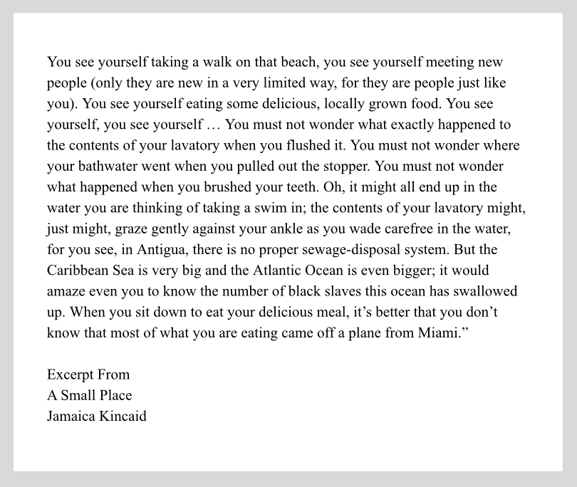 I’m reminded of a metaphor Jamaica Kincaid shares in her amazing work A Small Place. On tourism in Antigua, she writes: