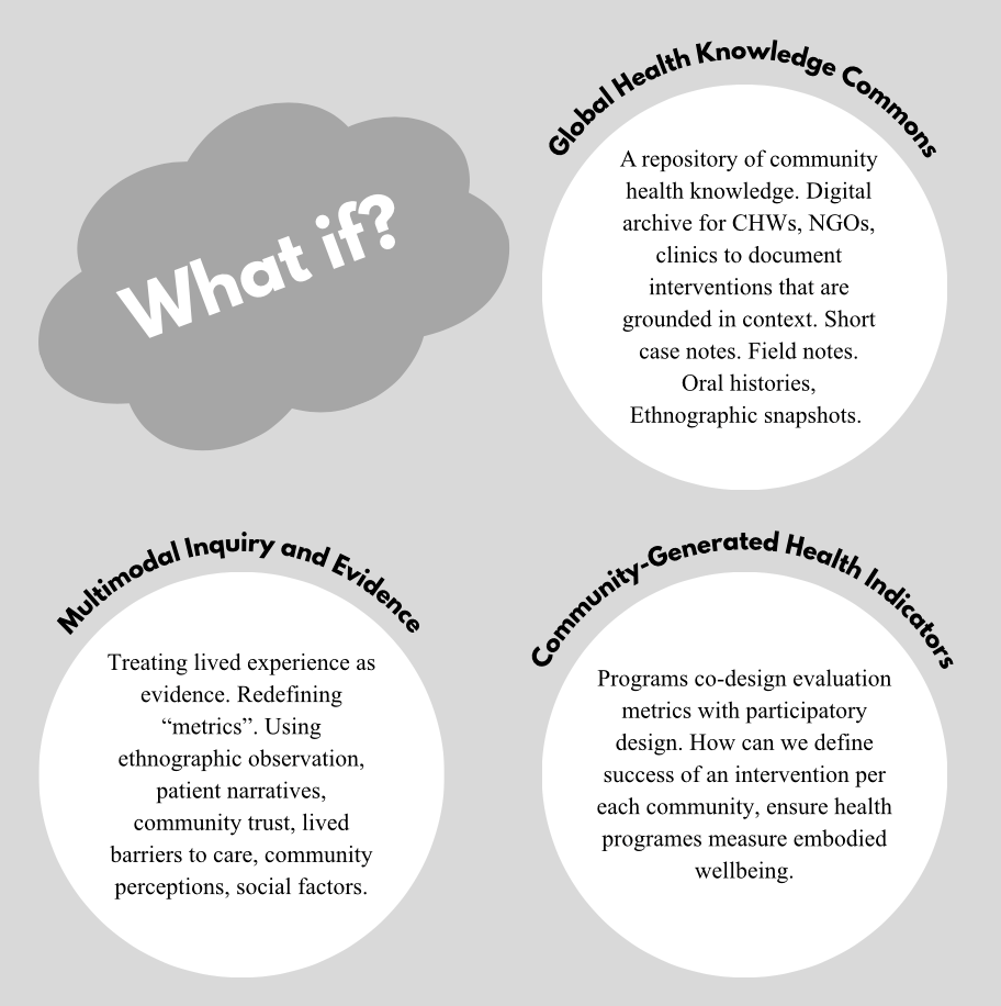 I feel the key to this shift lies in the grassroots. I am immediately reminded of the invaluable work of community health workers in many parts of the world. In India for example, ASHA (Accredited Social Health Activists) are uniquely positioned in intersectional roles that involve trust building, health education, and the esoteric knowledge of complex social dynamics [8]. These efforts may reduce risk over years rather than months, but prevent illness rather than cure it, and strengthen local health infrastructures in ways that are difficult to translate into clean epidemiological indicators. The work is critical to maintaining health, and critical to unify into global health perspectives.